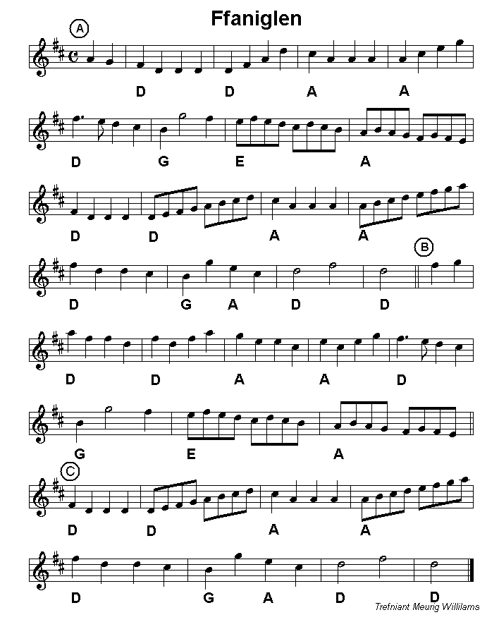 typically 6 times or more. The theme tune is Ffaniglen which appears in the Machynlleth set earlier in this collection and in Alawon Sesiwn. It's a tune which is ideal to play with and adapt: the simple version shows how half the notes in the fast runs in bars 7&8, 10&12, 23&24 and 26&28 can be simplified. More experienced players can put their own runs into bars 3&4. Normal practice is to start the dance fairly slowly to give the dancers a chance to learn it and after a few rounds, increase the speed with each successive round. An alternative tune is vital after playing the main theme twice or more to lelarn the dance. This is provided here by Difyrrwch Gwŷr Llanfabon (Delight of the men of Llanfabon) which is in the Rali Twm Sion set in this collection and in Alawon Sesiwn 2. The Dance Partners stand side by side in a circle holding hands with boy on the inside, facing anti-clockwise. A1: Partners set outwards, then back in, walk forward 3 paces and turn to face the other way, changing hands. Repeat back to the starting point. A2: Arm right and left B1: Clap own hands twice, once with partner's right Clap twice, once with partner's left Clap own hands twice, own shoulders crossed once Clap own hands twice, partner's both hands once. B2: Dance the polka or spin and return to start again for the next round |