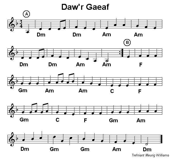 This set comprises two traditional Welsh tunes and a more recent one. Daw'r Gaeaf (the winter is coming) has the traditional haunting Welsh AABA structure with the first part A in a minor key (Dm) which is restated, then in part Bgoes into the relative major (F) before reverting to the minor of part A to finish. A simplified version of the Plygain carol Hir Oes i Fair (a long life to Mary) follows in G major. The set closes in 6/8 time with Tua Beth'lem Dref (On to Bethlehem Town), with words written by William Evans (bardic name Wil Ifan) set to music with the ABA structure. The melody was written in 1934 by music Professor David Evans under the pseudonym Edward Arthur and was used in the 1987 film of Dylan Thomas' A Child's Christmas in Wales. |