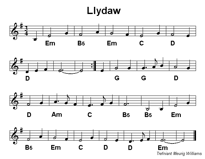 has lasted over the centuries as testified by the use of Llydaw as one of our hymn tunes for many years. Frank Hennessy remarks that a good tune can be recycled well in many ways and Jig Llydaw testifies this, playing the original melody as a jig. Note the B5 chord which leaves the democratic option of Bminor or Bmajor/ B7 to the accompanists. The simply structured Jig y Goes Chwith completes the lightening of the mood of the set iin three repeating parts, each including a repeating phrase. |