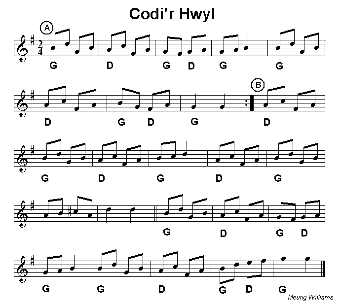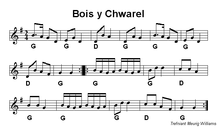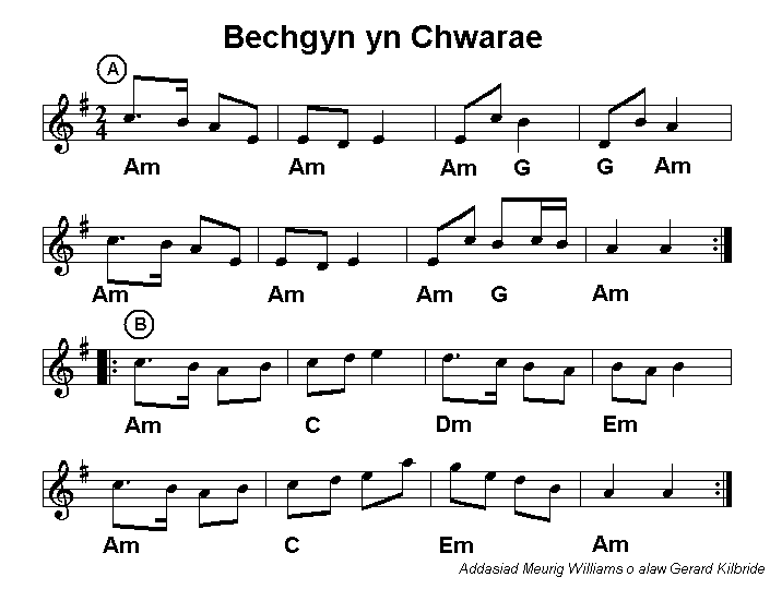 Cware as named in some collections. Bechgyn yn Chwarae (Boys Playing) is a development of this in A minor by fiddler Gerard Kilbride. Codi'r Hwyl (Lifting the Mood) is an original tune which brings us back to the more cheerful key of G to conclude the set. |