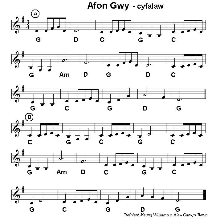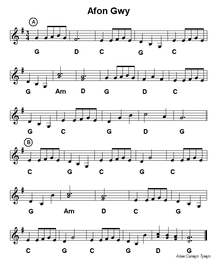 website. This set appeared in a previous month pitched in C major which play very well on the harp and also on the fiddle and C whistle. This time the set is pitched in G major and D major which go well on the fiddle and D whistle and harmonies have been included for each tune. The key changes to D for Y Trydydd Dydd (the third day - a Christian reference) and then back to G for Carwyn's Afon Gwy (River Wye) which presents the lovely flowing nature of the river to complete the set. |
