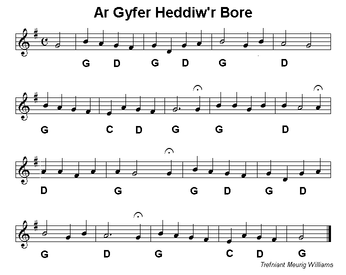 garol gan Barti Fronolau sydd yn y cyflwyniad sydd uwchlaw. Gall Ar gyfer Heddiw'r Bore weithio fel darn offerynnol fel y''i cyflwynir isod lle cai ei ddilyn gan yr hen alaw Dŵr Glân sy'n cael ei chwarae gan Oli Wilson Dickson. yn ei gyfres Alaw Gymreig yr wythnos. cyflwynir yr alaw yn A leiaf isod, ond mae Bob Evans yn ei chanu hi ar y ffidil yn G leiaf, gan ddefnyddio'r tant G gwaelod fel drôn i roi sylfaen cadarn iddi. |