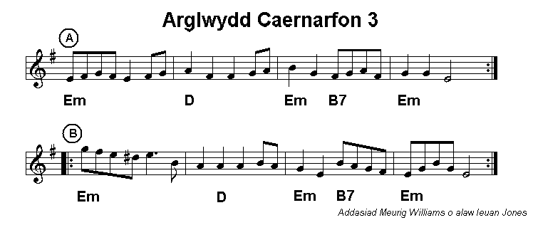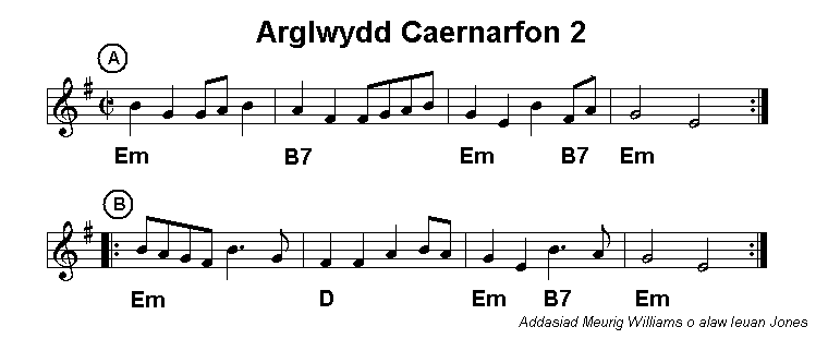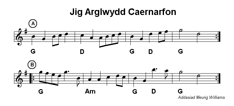 This is one of the standard dances for Welsh dance teams and is often used in a Twmpath (Barn dance) when the dancers have gained a little experience. Although it is named as a jig, the music is written and played as a polka. The second two tunes are variations on the main tune by the late Ieuan Jones who composed a number of varions for dance tunes as accompanist for the Twrch Trwyth Caridiff dance team. |