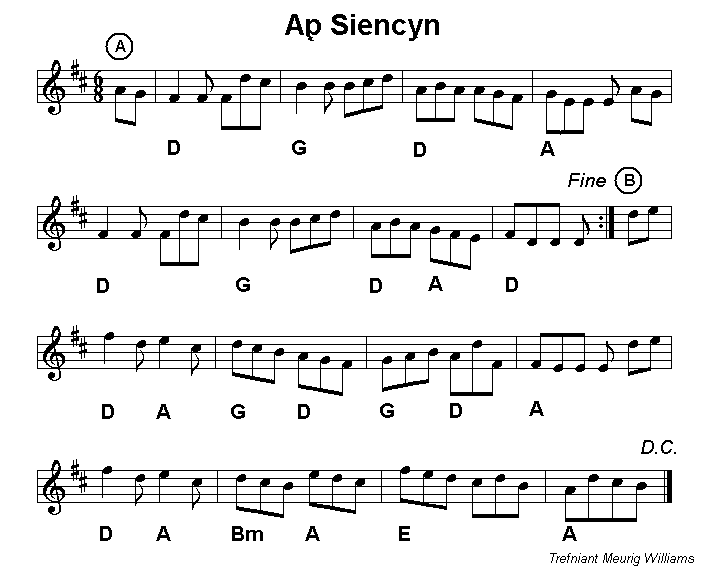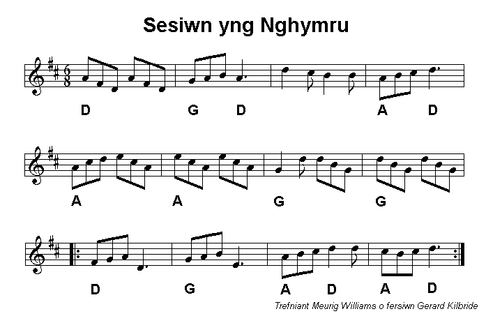 from Sain Records. This is followed by the jig Sesiwn yng Nghymru which fiddler Gerard Kilbride presented in a Clera workshop. Ap Siencyn is a well known Welsh jig which is presented here in the key of D. Bob Evans plays it slowly, like a waltz. |