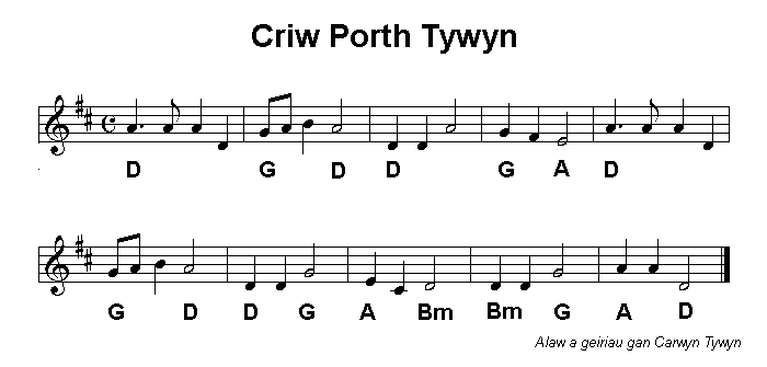 1. Criw Porth Tywyn, gwelwch chi O ai-o, O ai-o Rhwng y môr a'r mynydd fry O ai-o, O ai-o O ai-o, O ai-o 2. Dacw’r fforest ar y dde O ai-o, O ai-o Traeth Cefn Sidan ac Eglwys Penbre 3. Hwylio draw i Benrhyn Gwyr O ai-o, O ai-o Draw i Ddyfnaint erbyn yr hwyr O ai-o, O ai-o; O ai-o, O ai-o 4. Dacw’r goleudy gwyn a choch O ai-o, O ai-o A’r stondin grempog, a’r stondin cig moch O ai-o, O ai-o; O ai-o, O ai-o 5. Hwylio’n ôl i fewn i’r doc O ai-o, O ai-o A’r lads yn yfed o dan y cloc O ai-o, O ai-o; O ai-o, O ai-o 6. Criw Porth Tywyn, gwelwch chi O ai-o, O ai-o Rhwng y môr a'r mynydd fry O ai-o, O ai-o; O ai-o, O ai-o |