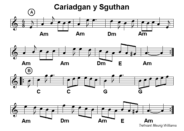 rhan A, yn nodweddiadol o lawer o alawon traddodiadol Cymru. Mae'r alawon yn gweithio'n dda gyda thelyn lifer wrth osod G# yn wythfed isaf yr alaw a G naturiol yn yr uchaf. |