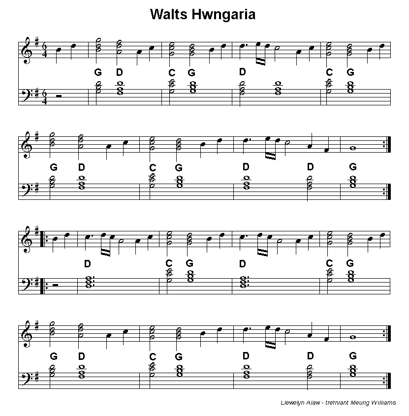 melody with chord symbols. Walts Hwngaria (Hungary Waltz) is included in the National Museum of Wales' collection of music by the popular 19th century Aberdare Welsh harpist Llewelyn Alaw. Dafydd Ifan Thomas is also one of his tunes, a good warm-up piece for harpists as it runs up the strings. Rîl Llanofer is one of the well-known tunes played in the 19th century around Abergavenny under the sponsorship of Lady Llanover who was a great promoter of the Welsh language and cluture. |