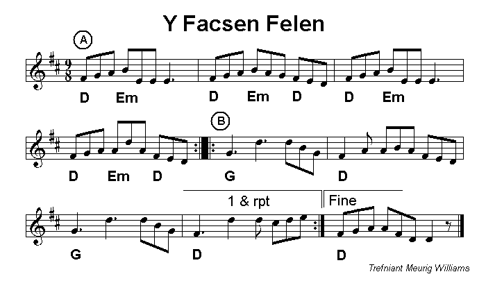 variations in his playing. The Kilbride brothers learned Y Facsen Felen from guitarist Dafydd Saer. Bernard points out that slip jigs like Y Facsen Felen are not as common in Welsh traditional music as they are in Irish music. |