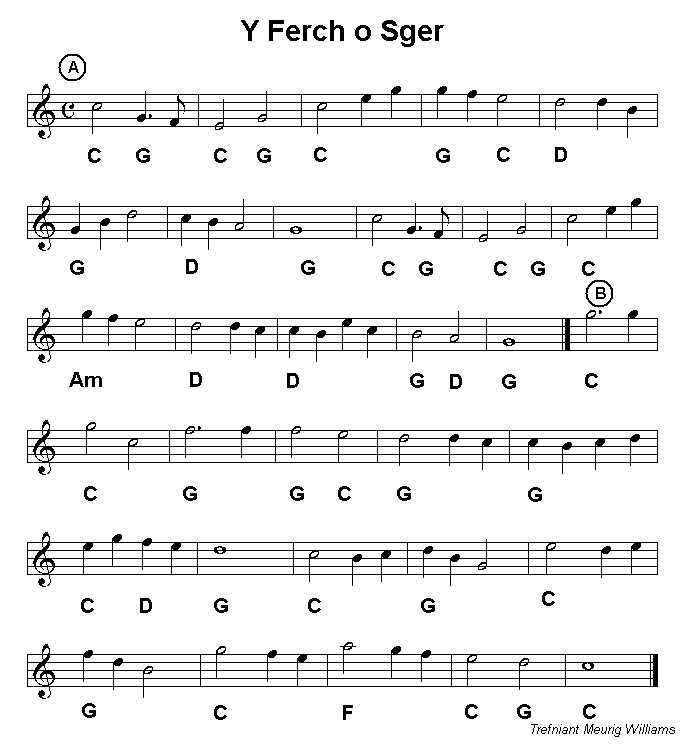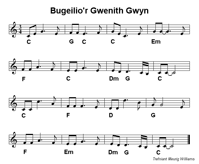 South Wales. Bugeilio'r Gwenith Gwyn (watching over the white wheat) is a song known and sung all over Wales and associated with the unrequited love of Wil Hopkin for the Maid of Cefn Ydfa, a house in Llangynnwyd near Maesteg. It was noted by by Iolo Morgannwg early in the 19th century. Y Ferch o Sger (the maid of Sker) relates to Sker House near Porthcawl on the Glamorgan coast whilst Croen y Ddafad Felen (the skin of the yellow sheep) is a familiar dance tune across Wales. It appears elsewhere in this collection pitched in G which is the normal key when playing for dancers. |