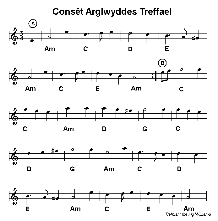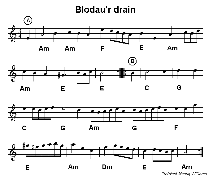 purchase from the website www.dawnsio.com. The tunes shown are taken from the set played at the Cardiff Session, influenced by the playing of Bob Evans whose crwth playing can be heard together with singer Mary Anne Roberts who perform and record as Bragod. See their website on www.bragod.com/ All three melodies are in the Welsh A minor which use a G# in the scale, giving an E major chord rather than the E minor generally found in Irish and Scottish tunes. All three also include a G natural. Apart from the ornament in the fifth bar from the end, Blodau'r Drain uses an F natural if the ornament in the fifth bar from the end is excluded whereas Consêt Arglwyddes Treffael uses mainly F#. Glwysen uses only the F natural, giving the emotive tone-and-a-half gap between it and the G# in the last but one bar of section A. Robin Huw Bowen refers to this as 'the Welsh interval' and uses the piece to start the Clerorfa set, Y Cyfwng Cymreig based on that interval. |