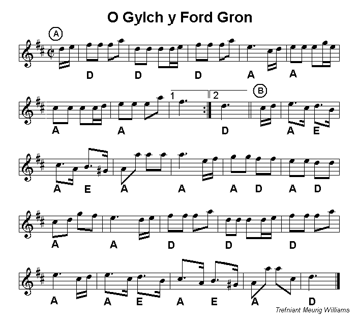 Morgannwg (Glamorgan Tribans). Two other lively tunes follow from the Welsh Folk Dance Society's book of music for dances presented by our member and world-renown Welsh triple harpist Robin Huw Bowen: Blodau'r Grug and O Gylch y Ford Gron. Both tunes can readily accept Mike Lease-type ornamentation. |