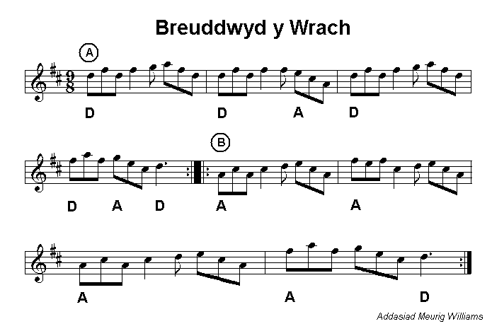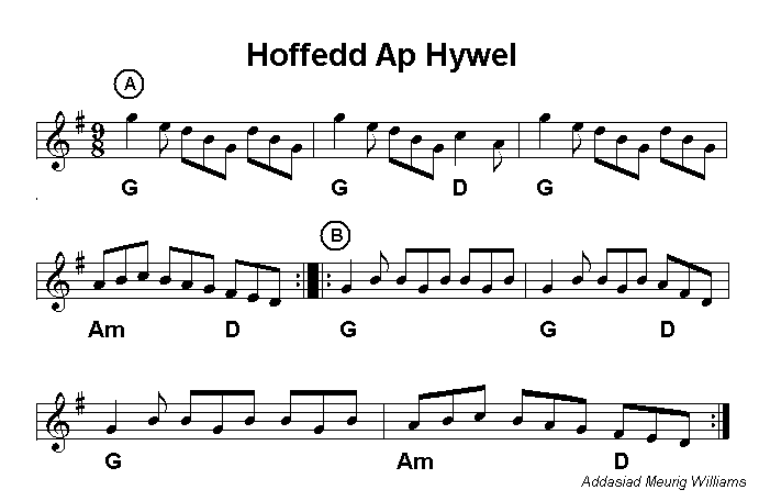 winter. Welsh slip jigs are played fast and the dances are lively. Hoffedd ap Hywel is usually played at the end to give a good finale. Nansi Richards who composed Cwrw Da was a legendary traditional Welsh harpist. Her playing was influenced not only by the traditional playing of her locality but also the playing of the gypsies who stayed on her family farm. A common arrangement when accompanying the dance is to play Hoffedd twice, Breuddwyd y Wrach and Cwrw Da once each, then Hoffedd twice again. |