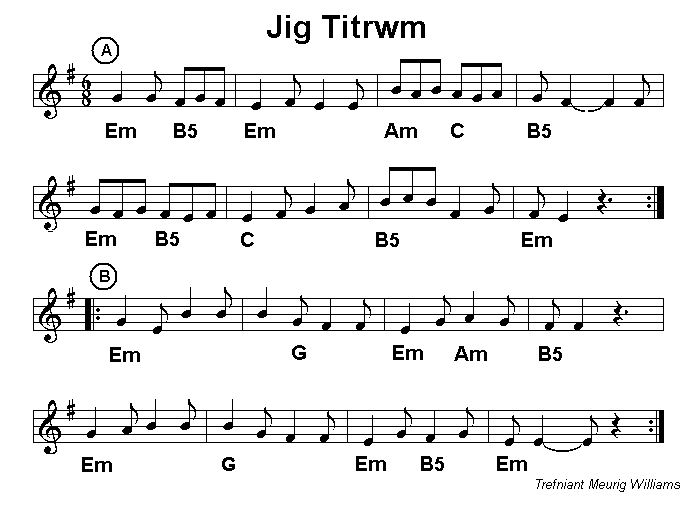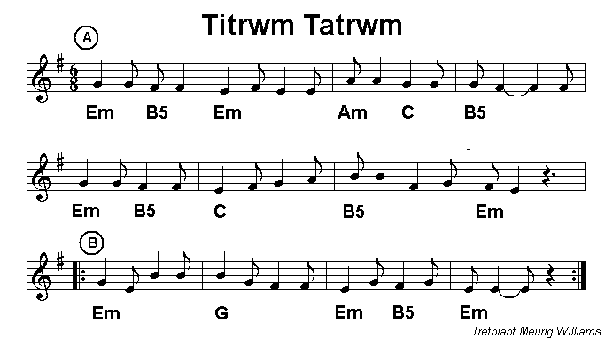 set starts with the plaintive Titrwm Tatrwm which is sung as a slow jig and included in the book of songs published by the Welsh folk group Mabsant. This plaintive melody is quite different from the children's song Titrwm, Tatrwm, Ffinestr Ffanastr and was introduced to the Cardiff session by Gareth (y gof) Thomas. Jig Titrwm is a livelier variation of the jig and Rhediad i'r Odyn (A run to the lime kiln) closes the set in a more cheerful mood. |