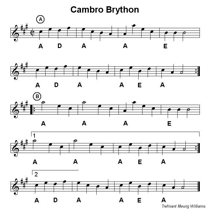 America over a hundred years ago. The set is played fast and lively. Cambro Brython is a little different from the usual in playing the second half of part A instead of the second half of part B when part B is repeated. Rachel Dafydd Ifan is polka which can be played as a square dance tune so it fits very well in the set with Moliannwn. |