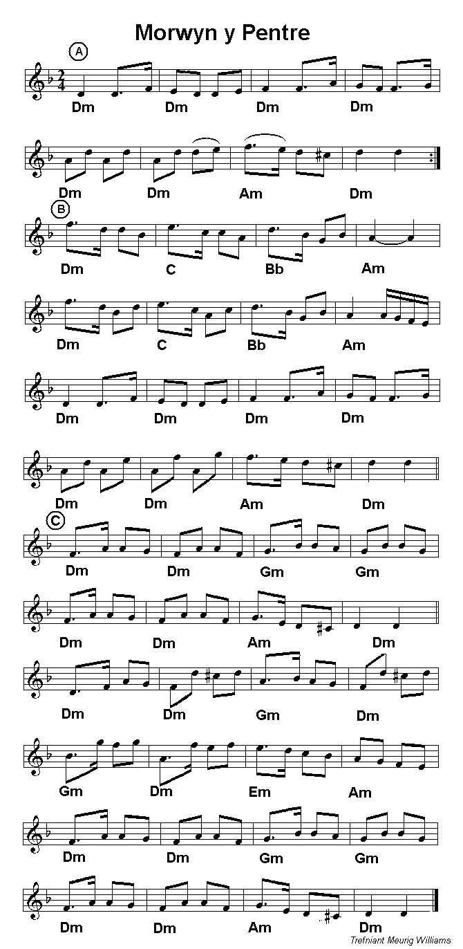 based on the key of D minor, with a cheering change to D major to close. Morwyn y Pentre (the Village Maid) is suited superbly to the wooden flute as played by Jem with a breathy emphasis on the first note of each bar. A shortened version of the melody is included in the set here but the full vesion which Jem based on the playing of John Shorland and Ceri Rhys Mathews is also included. Sawdl y Fuwch (the cowslip) which follows is associated with a popular Welsh dance and is included in a set of its own earlier in this collection. The set, like last month's, ends in a lively and jolly mood with Cainc y Datgeiniad (the singer's tune) which is commonly used as a base for Welsh Penillion singing. Click here to see notes by Jem and Stephen Rees on this set and facsimile copies of the original published versions by Nicholas Bennett and John Parry (Bardd Alaw) |
