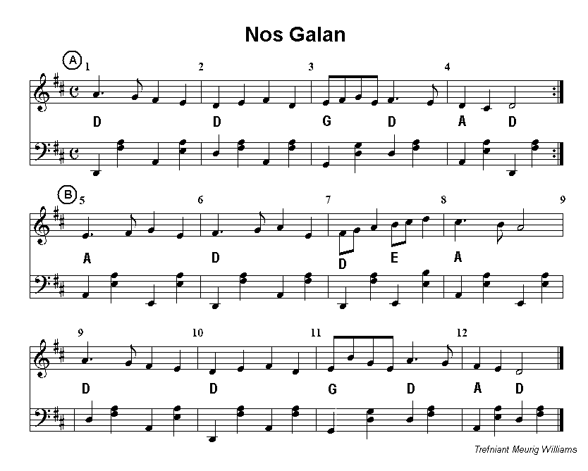 normal key for this, so both versions are included . The G wersion of Nos Galan leads nicely into Tŷ Coch Caerdydd (the Red House of Cardifff) which is a well-known Welsh dance tune included elsewhere in this collection. It is included here because a tune commonly used as an alternative melody in Welsh dances held around Christmas time is Jingle Bells which has the same 48-bar structure if played as a chorus, versre then chorus. |