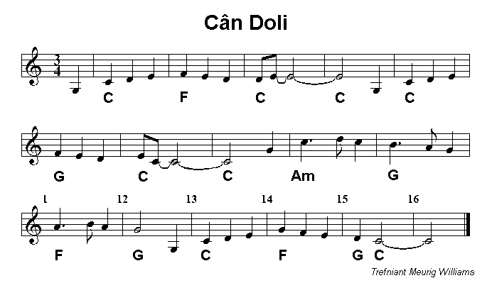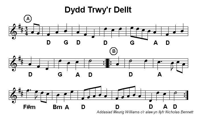 University websites. The tunes which follow are based on Nicholas Bennett's' outstanding collection of traditional Welsh tunes: 'Alawon fy Gwlad / The Lays of My Land'. The three waltzes are adapted to suit the normal 32 bar structure, with 8 bars in each of parts A and B repeated. The numbers of the two versions of Fy Noli (My Dolly), 1 and 2 correspond to Nicholas' titles, but the set runs well starting in G major for Fy Noli 2 before going to A minor for Fy Noli 1 and ending in D major for Dydd Trwy'r Dellt. |