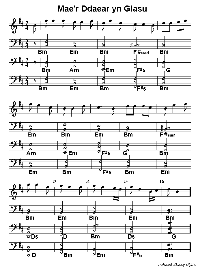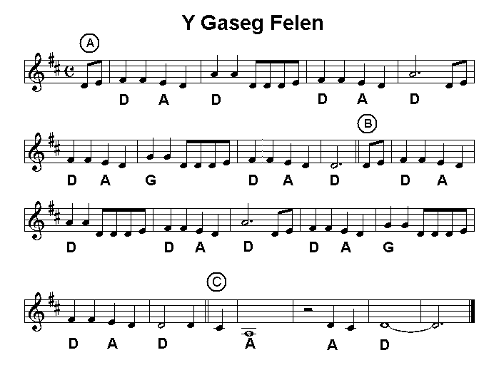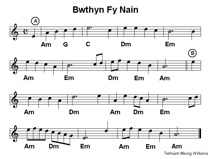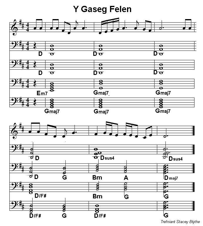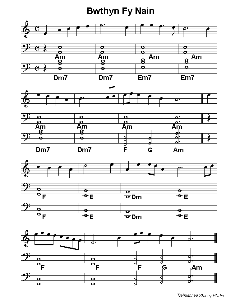 2023. She demonstrated how the arrangement how different arrangements of chords used to accompany a tune can control the modd and character of the song. The three songs which she used in this illustration were Bwthyn fy Nain, Y Gaseg Felen and Mae'r Ddaear yn Glasu. Each song is given first using more conventional chords and Stacey's arrangements follow. We have a recording of Stacey's Zoom presentation which is available free of charge to members: email post@meucymru.co.uk for the link. |