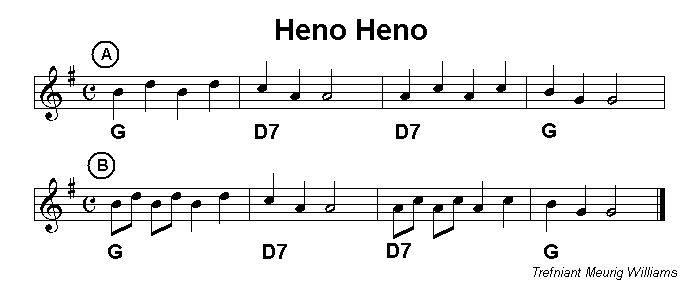 | 1. Heno, heno, hen blant bach, Heno, heno, hen blant bach, Dime, dime, dime, hen blant bach, Dime, dime, dime, hen blant bach. 2. Gwely, gwely, hen blant bach, Gwely, gwely, hen blant bach, Dime, dime, dime, hen blant bach, Dime, dime, dime, hen blant bach. 3. Fory, fory, hen blant bach, Fory, fory, hen blant bach, Dime, dime, dime, hen blant bach, Dime, dime, dime, hen blant bach. |
