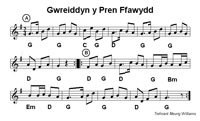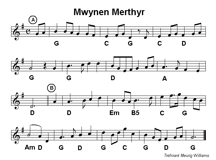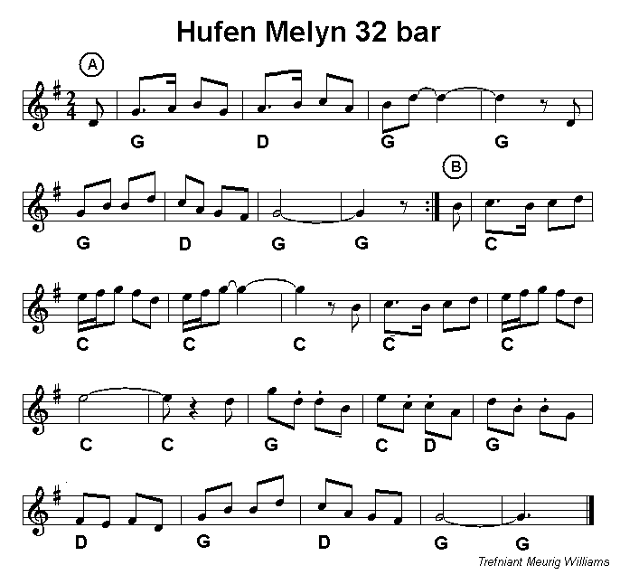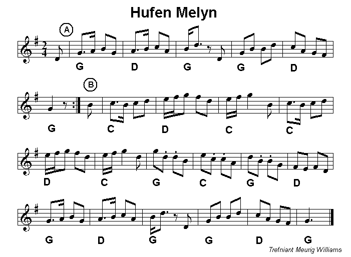 present a total of around 800 melodies. The lyrical Mwynen Merthyr is clearly from the South; Hufen Melyn is a familiar and catchy melody which does not fit into normal dance tune patterns, whilst Gwreiddyn y Pren Ffawydd is a standard 16-bar 2A 2B. |