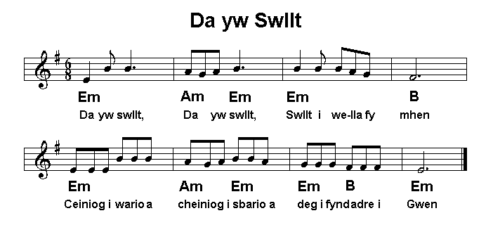 1. Da yw swllt, da yw swllt, Da i wella fy mhen. Ceiniog i wario a cheiniog i sbario A deg i fynd adre i Gwen. 2. Da yw deg, da yw deg...... ......... Ac wyth i fynd adre i Gwen 3. Da yw wyth ...... A chwech i fynd ... 4. Da yw chwech ..... A phedair ... 5. Da yw pedair ...... A dwy ... 6. Da yw dwy ....... A dim i fynd adre i Gwen! |