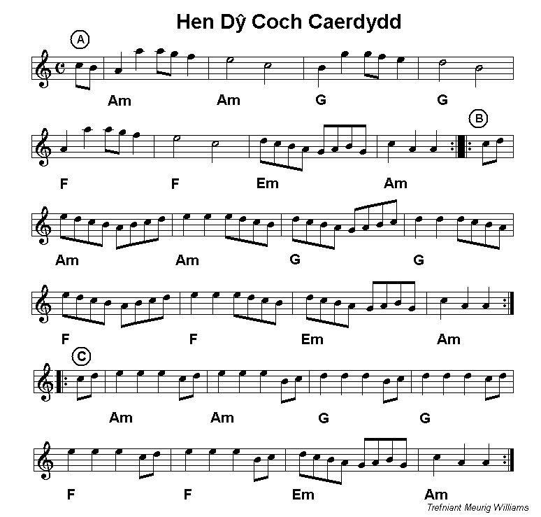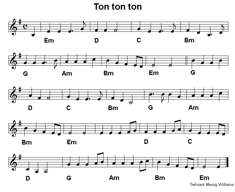 | 1. I ba beth y dyddaf brudd, Ie pam y byddaf brudd? I ba beth y byddaf brudd a throi llawenydd heibio? Tra fo'n ifanc ac yn llon, ie'n ifanc ac yn llon, Tra fo'n ifanc ac yn llon rhof hwb i'r galon eto. Cytgan: Ton ton ton dyri, ton ton ton dyri, ton ton ton dyri, ton ton ton; Ton ton ton dyri, ton ton ton dyri, ton ton ton dyri ton ton. 2. Mae gen i fuwch, wynebwen lwyd, ie fyth, wynebwen lwyd, Mae gen i fuwch, wynebwen lwyd, hi aiff i'r glwyd i ddodwy. A'r iâr fach yn glaf ar lo, ie fyth, yn glaf ar lo, A'r iâr fach yn glaf ar lo, nid aiff o ngho i 'leni. (Cytgan) 3. Saith o adair man y tô, ie, adair man y tô, Saith o adair man y tô, nid ffrai wrth daflu disiau; A'r ddylluan a'i phig gam, a'r ddylluan a'i phig gam; A'r ddylluan a'i phig gam, yn chwerthyn am eu pennau. (Cytgan) 4. Mae gen i 'sgfarnog gota goch, ie, 'sgfarnog gota goch, Mae gen i 'sgyfarnog gota goch, a dwy gloch wrthi'n canu; A dau faen melyn yw ei phwn, dau faen melyn yw ei phwn, Dau faen melyn yw ei phwn, yn maeddu milgwm Cymru. (Cytgan) |